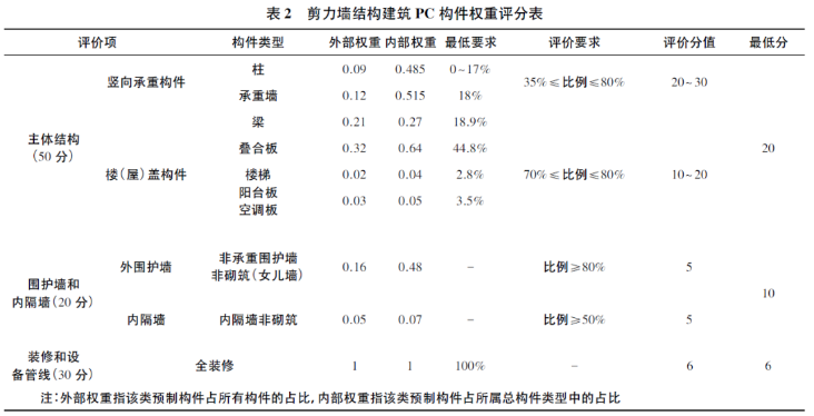 鑒于剪力墻結(jié)構(gòu)在我國的普及性,本文以裝配式剪力墻結(jié)構(gòu)體系為研究對象,通過對我國11項代表性裝配式建筑工程的統(tǒng)計分析,得出裝配式建筑剪力墻結(jié)構(gòu)的外部權(quán)重和內(nèi)部權(quán)重,以及評級標(biāo)準(zhǔn)規(guī)定的單項構(gòu)件預(yù)制率的最低要求,結(jié)合《標(biāo)準(zhǔn)》評分表,剪力墻結(jié)構(gòu)預(yù)制構(gòu)件率最低要求和相應(yīng)權(quán)重如表2所示。