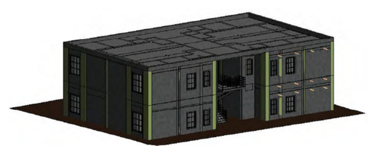 本工程為兩層剪力墻結(jié)構(gòu)住宅,共計4戶,二類建筑,采用65㎡標(biāo)準(zhǔn)化戶型模塊,建筑總面積570.16㎡,共兩層,采用裝配剪力墻結(jié)構(gòu)體系,目標(biāo)裝配率為78%,AA級裝配式建筑,工程全裝修。圖4為本工程的BIM三維圖。