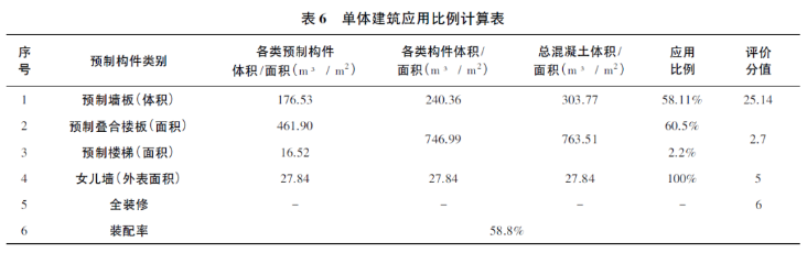 當(dāng)樓梯、內(nèi)墻、剪力墻、疊合板、女兒墻等構(gòu)件分別采用預(yù)制構(gòu)件的情況下,利用BIM通過計算規(guī)則計算預(yù)制部品部件的應(yīng)用比例,其應(yīng)用比例計算結(jié)果見表6。