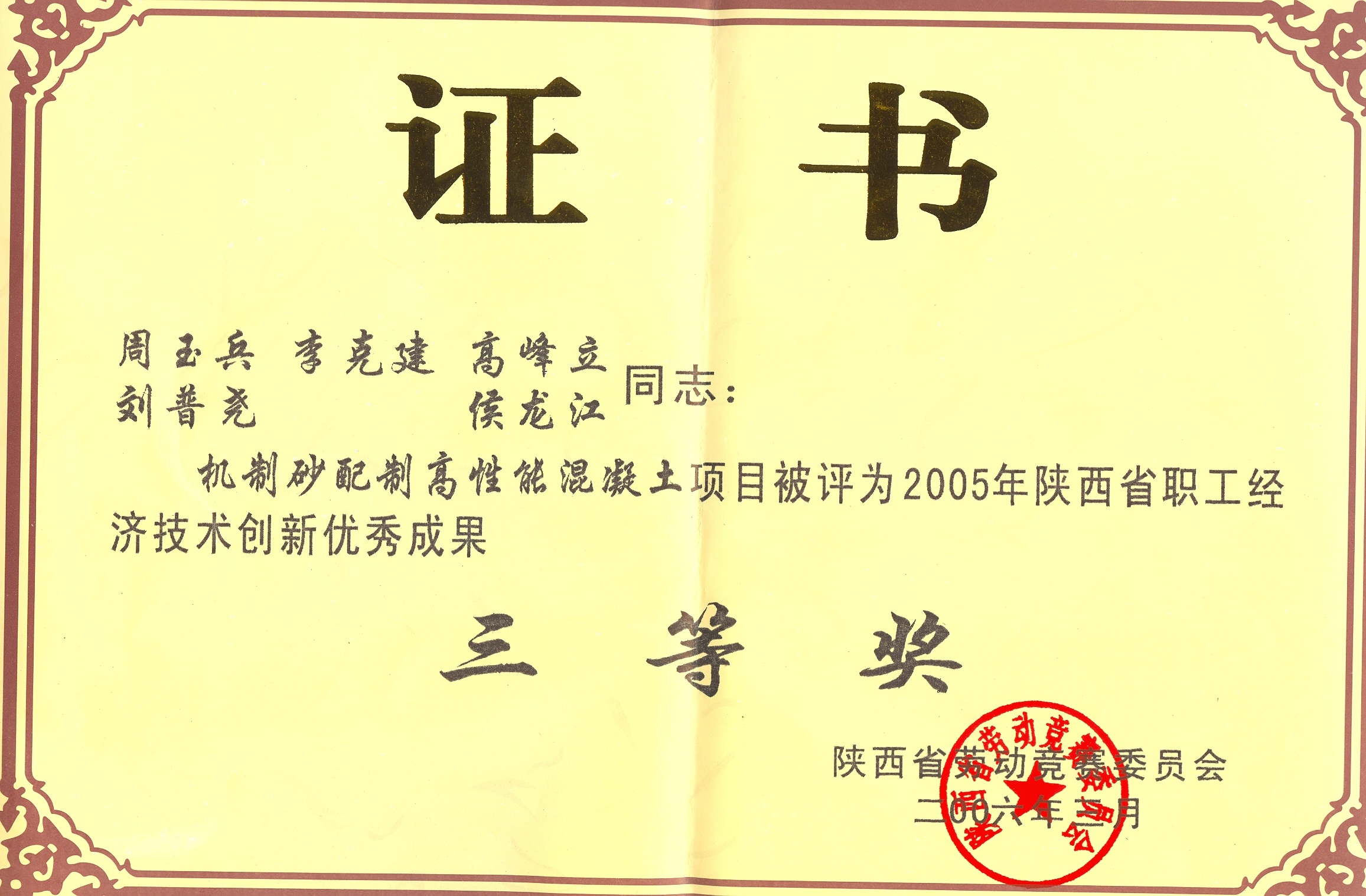 《機(jī)制砂配制高性能混凝土》獲陜西省職工經(jīng)濟(jì)技術(shù)創(chuàng)新優(yōu)秀成果三等獎(jiǎng)